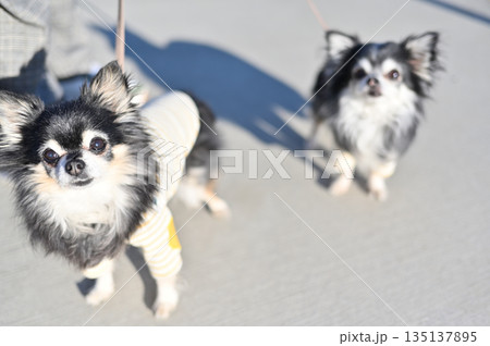 仲良く見上げてアイコンタクト 2匹のチワワ