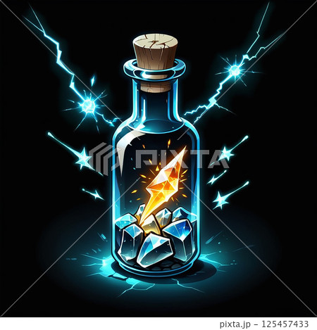 Glowing potion bottle with blue lightning spark and shining crystals inside on a black background, creating a mystical and magical atmosphere.
