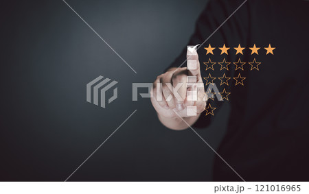 Customer Review, Young Man hand touching emoji and five star to review and give 5 stars