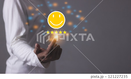 Customer Review, Man touch smile emoji to review and give 5 stars with very good results in service
