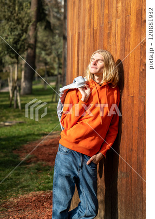Relaxed blond guy scandinavian androgynous appearance enjoying sun standing near wooden fence.