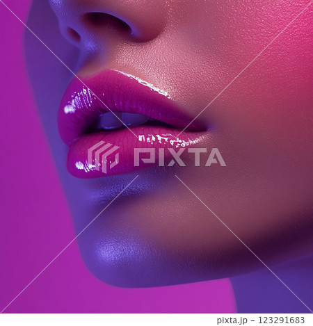 Close-up of pink glossy lips with vibrant neon lighting. The lips glisten, highlighted against a contrasting background.