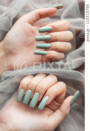 Elegant green manicure displayed on softly draped fabric with hands positioned artistically