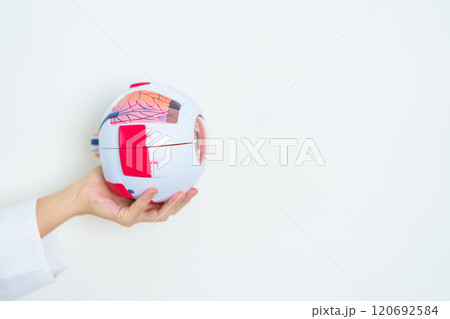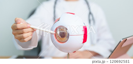 Doctor with human Eye anatomy model with magnifying glass. Eye disease, Refractive Errors, Age Related Macular Degeneration, Cataract, Diabetic Retinopathy, Glaucoma, Amblyopia, Strabismus and Health