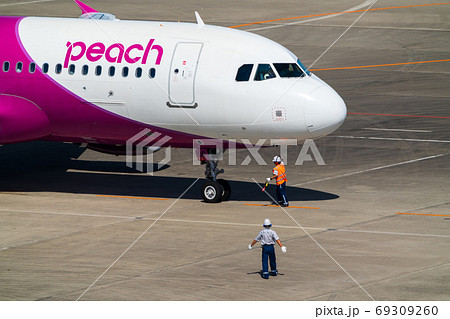 空港の風景 離陸する飛行機と見送るグランドハンドリングのスタッフ 宮城県名取市