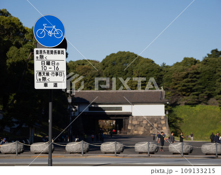 皇居外苑のパレスサイクリングコース上に設置された規制標識と補助標識・桜田門の見える風景