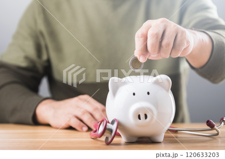 Man drops a coin into a white piggy bank, with a stethoscope on the table. This image symbolizes the connection between financial planning and healthcare, emphasizing the importance of both