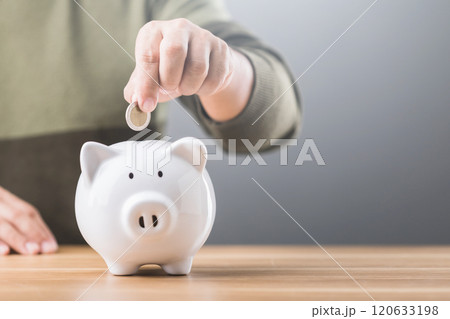 Man drops a coin into a white piggy bank on a table, symbolizing the practice of saving money. This image reflects financial responsibility and future planning