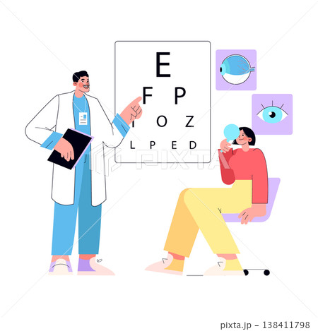 Eye test vector illustration showing an optometrist pointing at an eye chart while a patient sits holding a lens. Designed to depict a routine vision examination in a medical setting.