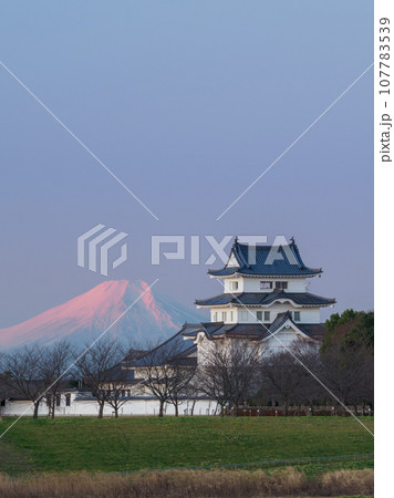 夜明けの富士山と関宿城復元天守閣の絶景風景
