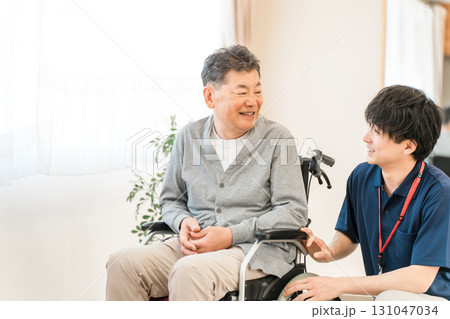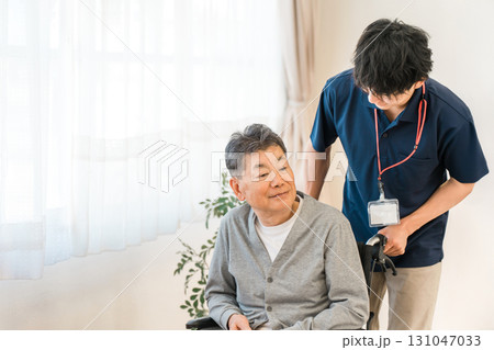 車椅子のシニア男性患者と介護士・ケアマネージャーの男性スタッフ(認知症・リハビリ)