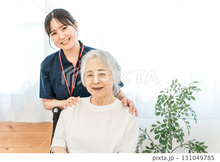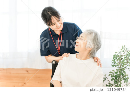 車椅子のシニア女性患者と介護士・ケアマネージャーの女性スタッフ(デイサービス,介護施設)