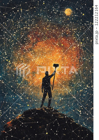 Silhouette of a figure standing on a mound holding a hammer against a celestial backdrop filled with stars and cosmic colors in a dark sky