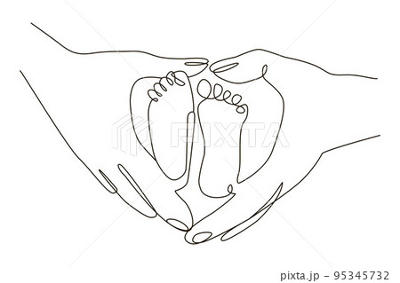 Single continuous line drawing baby hand. Closeup of baby hand into parents hands. Family concept. Tiny Newborn Baby's and parent hands. Dynamic one line draw graphic design vector illustration