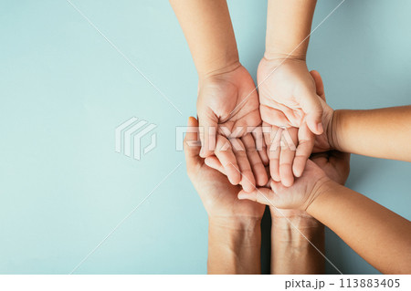Closeup top view family hands stack palms studio shot isolated on blue background, parents and kid holding empty free space on hand together, Gesture sign of support and love, Family and parents day