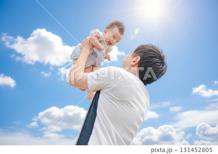 私服の父親とジャンプする幼児、赤ちゃんを抱っこするイラスト(育児・お出かけ)
