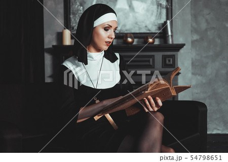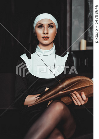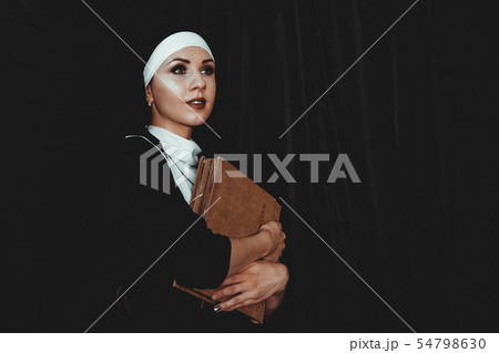 Beautiful young nun in religion black suit holds Bible. Religion concept