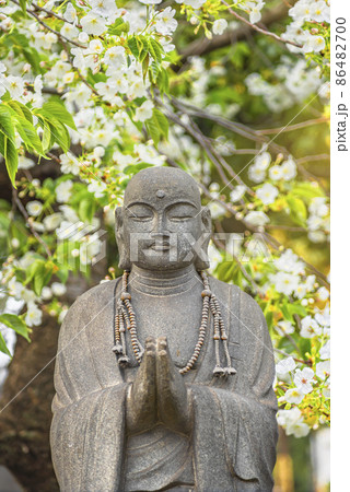 [東京・谷中] 桜を背景に立つ合掌の印相をする地蔵菩薩の石像。