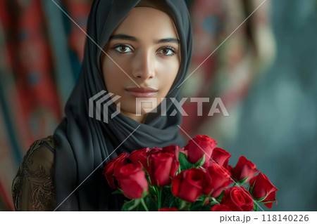 Young Woman in Hijab Holding Red Roses with Soft Background Focus and Ethereal Beauty, AI-generated item