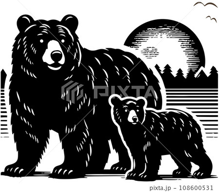 自然豊かな台地を歩く熊の親子のシンプルイラスト