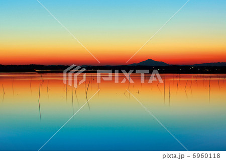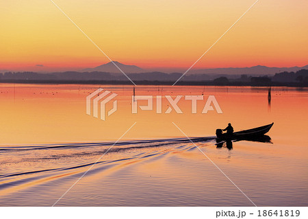 ロマンチック茨城(夕景の筑波山を望む松林の湖畔に釣り人がひとり糸を垂らす。優雅な時。)涸沼、親沢公園