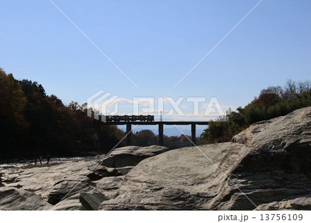 秋の長瀞 荒川の紅葉と鉄橋 c