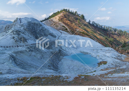 日本 秋田県湯沢市の川原毛地獄の灰白色の溶岩に覆われた山肌と地獄のような荒涼な景色