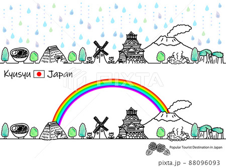 梅雨の九州の観光地の街並シンプル手描き線画セット