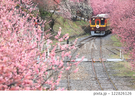 わたらせ渓谷鐵道「花桃の花咲く神戸駅付近を走る列車」