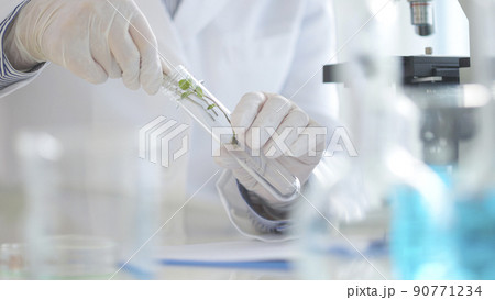 顕微鏡で野菜の成分を観察する若い研究者 管理栄養士