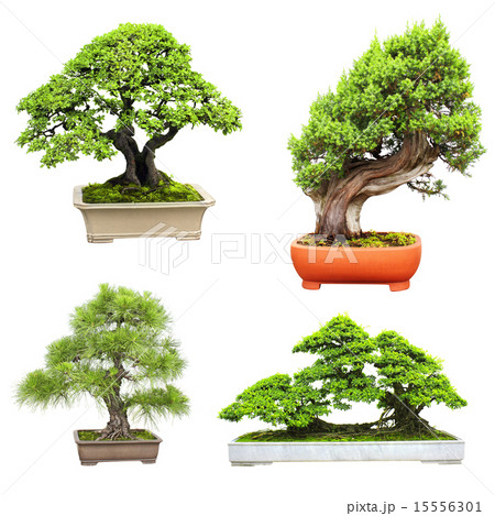 Collection of bonsai tree. Set of bonsai of different shapes in clay pots