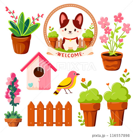 Home garden, hobby, Gardening, leisure set. Cartoon flower, birdhouse, bird, plant in flowerpot. Can be used for for scrapbooking, greeting card, poster, tag, sticker kit. Vector illustration EPS8