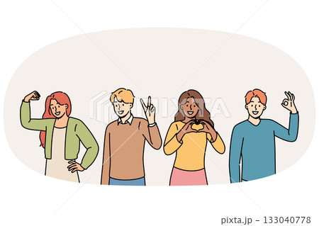 Gestures of agreement and approval are demonstrated by multiracial people, sign of solidarity