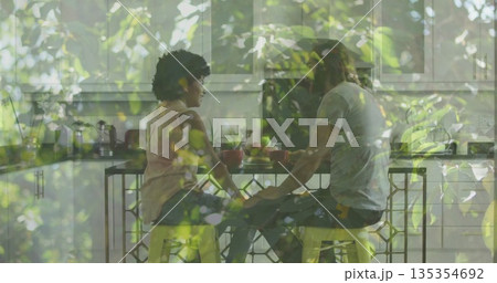 Holding hands couple sitting at black kitchen island, with fruit bowl, mugs and green leafy overlay