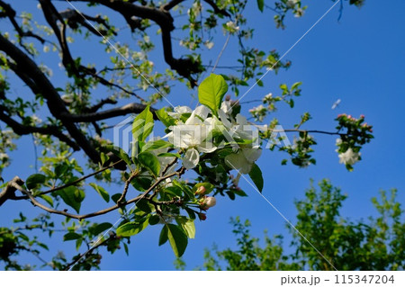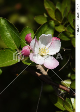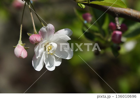 春4月陽光を浴びて咲くピンクの蕾と白い花のツクシカイドウ