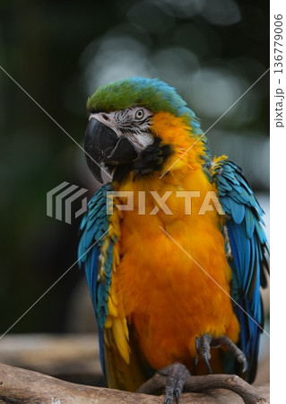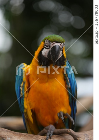 カラフルな羽が美しいルリコンゴウインコの正面ポートレート 神戸どうぶつ王国