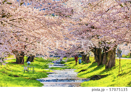 春の桜並木 満開の観音寺川の桜 福島県猪苗代町