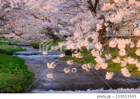 福島県耶麻郡猪苗代町川桁 早朝の観音寺川の流れとトンネルを作る両岸のソメイヨシノの桜並木