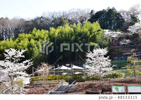 群馬県高崎市 観音山公園の管理棟とエントランス広場と満開桜と新緑