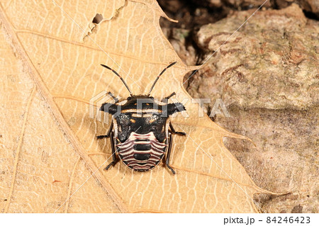 生き物 昆虫 ウシカメムシ、五齢幼虫です。成虫と異なり肩の突起にノコギリ歯がついています