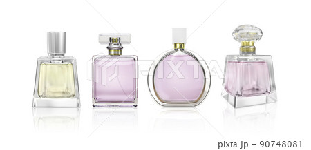 Cosmetic glass bottle mockups of realistic perfume and fragrance spray, vector set. Transparent glass bottles of perfume atomizer with silver metal caps and crystal lids for perfumery cosmetic mockups