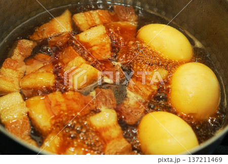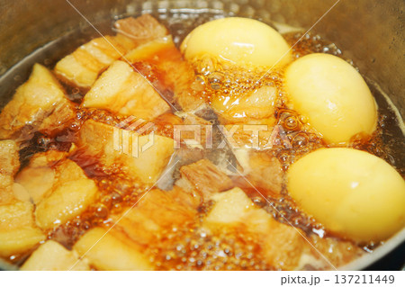 鍋で煮込んでいる豚の角煮と煮卵