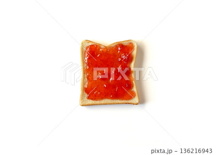 真上から見た白背景のいちごジャムを塗った食パン