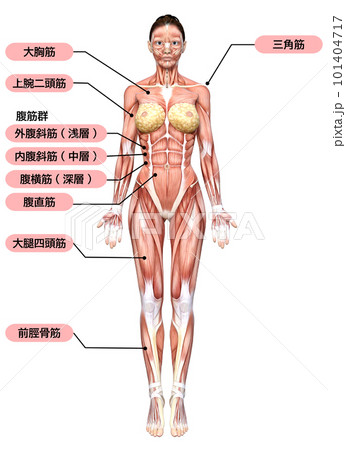 女性の筋肉解剖図のイラスト 3Dモデルの全身正面