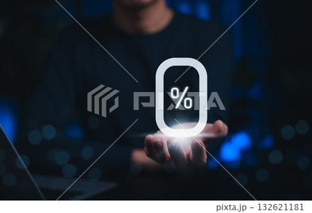 Zero percent interest concept. Man holding glowing 0% symbol in hand representing financial offer, campaign, loan promotion, or marketing deal with no interest rate for digital banking or fintech.