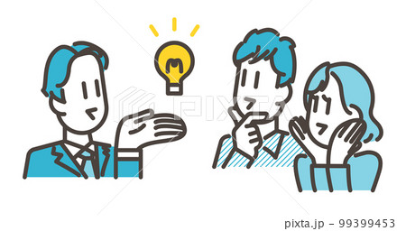 笑顔で男性ビジネスマンの説明を受ける若い夫婦【ベクターイラスト素材】