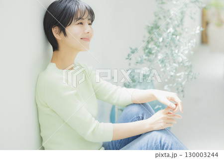 壁にもたれている若い女性