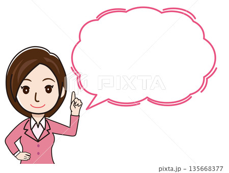 吹き出しと指差しで案内・アドバイスをするビジネスマンの女性のイラスト(コピースペース・ベクター素材)