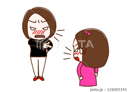 (複数)怒って指さして怒鳴る女性と怒りで対抗して言い合う少女