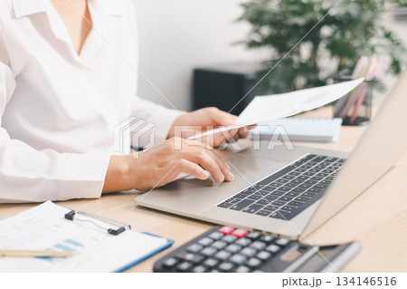 Businessperson typing on laptop with financial report and pen on office desk, concept of data analysis, digital business, accounting management, productivity and corporate finance planning.